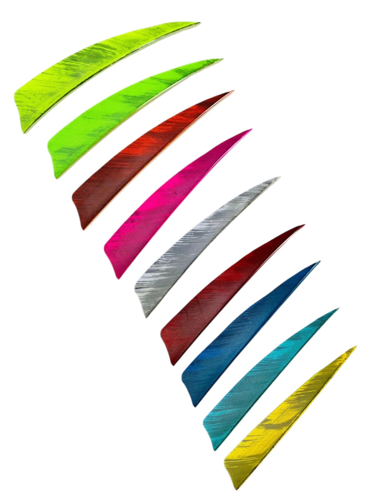 4″. this feather will average 15.5 millimeters tall at it’s highest point. its average weight will be 2.95 grains each and is used for both hunting arrows and target arrows. this feather can be used on all types of arrow shaft materials. is best applied with any fletching glue and can be used by either a right handed or left handed archer.