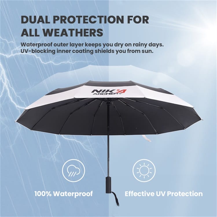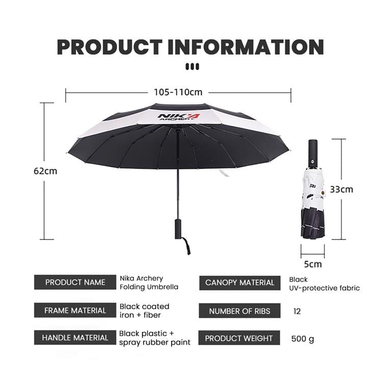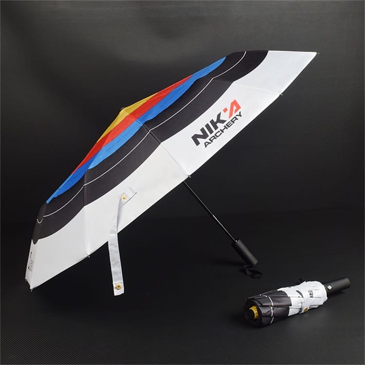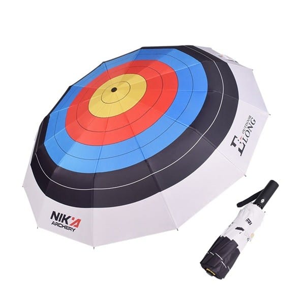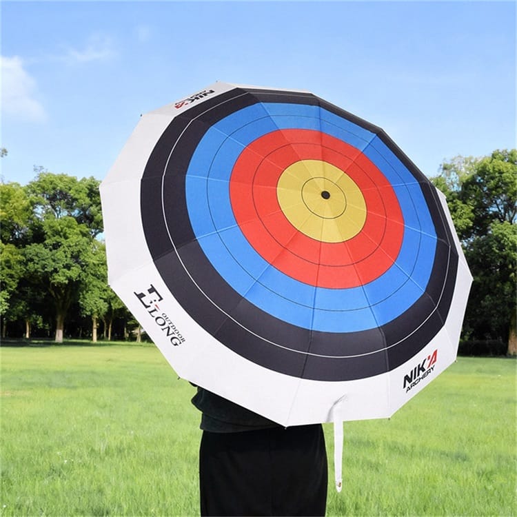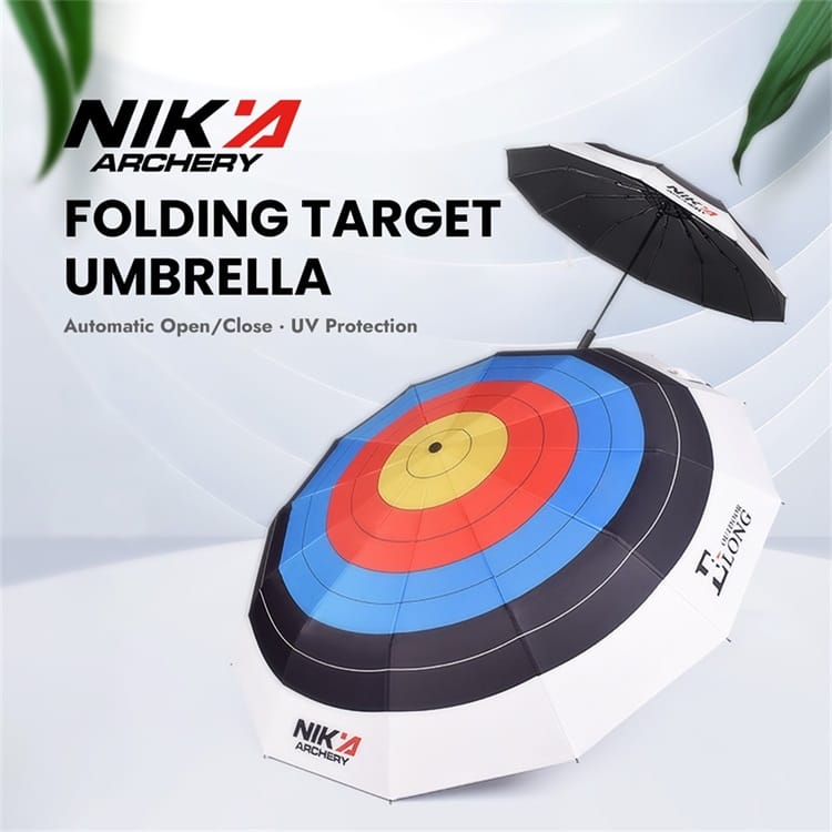 Designed for archery lovers, the Nika Archery Target Umbrella features a target-inspired canopy, UV-blocking black coating, automatic open/close function, and a wind-resistant 12-rib frame. Compact and portable for commuting, training, and outdoor use.